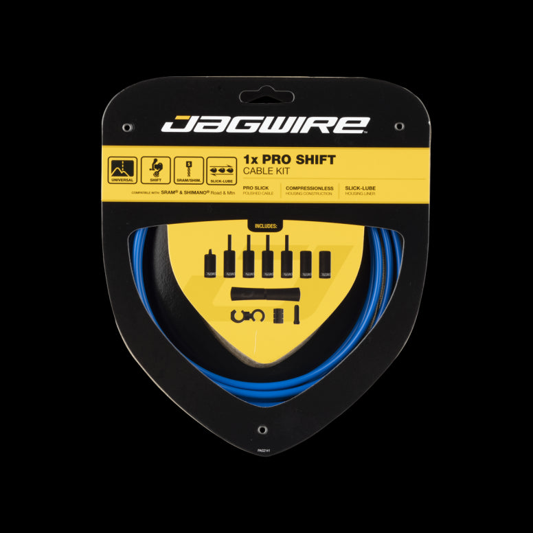 Jagwire Pro Shift kits deliver improved performance and style. Pro polished cables used with improved Slick-Lube liners provide an upgrade over OEM cable systems, with enhanced shifting precision and long-lasting performance. Available in 1x or 2x versions, our Pro Shift kits are designed to work with nearly all frames and shifting systems. And with small parts included for both road and mountain systems, these kits are quick and easy to install. Pro Shift kits are offered in 10 colors to match Jagwire's Pro Brake and Hydraulic Hose kits. Pro Polished Slick cables combined with Slick-Lube liners offer enhanced shifting precision and long-lasting performance. All parts are included for a complete shift cable and housing installation on a road or mountain bike. Kits contain extra-long inner cables and ample housing for large frames or continuous housing runs. 2x kits are designed for use with both front and rear derailleurs, while 1x kits are for rear derailleur or internally geared hub only. Black kits contain gloss black housing with silver logos; Stealth Black kits have matte black housing featuring black logos.